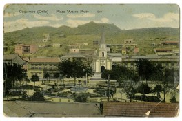 Coquimbo (Chile)-Plaza "Arturo Prat"-1910 : [Al centro de la Plaza, una fuente de agua, traida de Europa por Maximiano Errázuriz; Frente a la Plaza: Iglesia San Pedro, Casino Valparaíso, y otros edificios] [fotografía] / Domingo Gallo R. Librería "La Porteña" Coquimbo : Domingo Gallo R. Librería "La Porteña", 1910. 1 tarjeta postal : colotipo, fotomecánico policromo sobre papel ; 14 x 9 cm. .