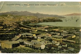 Coquimbo (Chile) - Vista General desde el Cerro "Dominante" - 1910 : [fotografía] / Domingo Gallo R. Librería "La Porteña" Coquimbo : Domingo Gallo R. Librería "La Porteña" , 1910. 1 tarjeta postal : colotipo, fotomecánico policromo sobre papel ; 14 x 9 cm. .