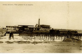 Oficina Salitrera. Vista general de la máquina : [Planta de elaboración, muelles y cancha de secado] [fotografía]. [Chile : Editor no identificado , Entre 1890 y 1900]. 1 tarjeta postal : huecograbado, fotomecánico monocromo sobre papel ; 14 x 8 cm. .