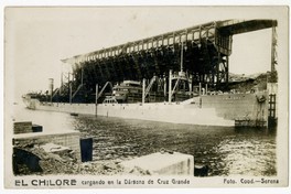 El Chilore cargando en la Dársena de Cruz Grande [fotografía] / Foto cood [La] Serena : Foto Cood, [Entre 1916 y 1926]. 1 tarjeta postal : fotografía, fotomecánico monocrom sobre papel ; 14 x 9 cm. .