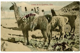 Llamas de la Cordillera, Chile [fotografía]. [Chile : Editor no identificado] , 1908. 1 : colotipo, fotomecánico policromo sobre papel ; 13,7 x 8,8 cm. .