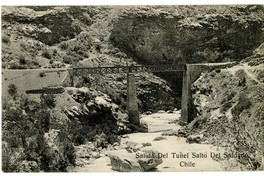 Salida del Tunel Salto del Soldado Chile : [Puente ferroviario sobre el río] [fotografía] / Santiago : Hume y Ca. , [entre 1910 y 1920]. 1 tarjeta postal : colotipo, fotomecánico monocromo sobre papel ; 13,7 x 8,6 cm. .