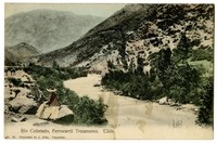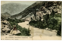 Río Colorado, Ferrocarril Trasandino, Chile [fotografía] / J. Allan. Valparaíso : J. Allan , 1921. 1 tarjeta postal : colotipo, fotomecánico policromo sobre papel ; .