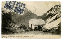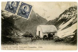 Casucha del Portillo, Ferro-carril Trasandino. Chile [fotografía] / J. Allan. Valparaíso : J. Allan , 1921. 1 tarjeta postal : colotipo, fotomecánico monocromo sobre papel ; 13,5 x 8,7 cm. .