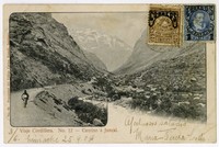 Viaje Cordillera. N° 12. - Camino á Juncal [fotografía] / Carlos Brandt. Santiago : Carlos Brandt , 1904. 1 tarjeta postal : colotipo, fotomecánico monocromo sobre papel ; 13,2 x 7,8 cm. .