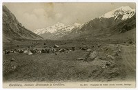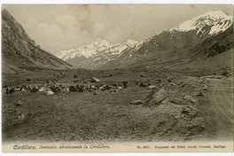 Cordillera, Animales atravesando la Cordillera [fotografía] / Adolfo Conrads. Valparaíso : Adolfo Conrads , [Entre 1907 y 1915]. 1 tarjeta postal : colotipo, fotomecánico monocromo sobre papel ; 13,8 x 8,3 cm. .