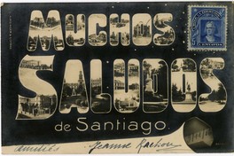 Muchos Saludos de Santiago [fotografía] / C. Kirsinger & Cia., Chile : C. Kirsinger & Cia. , 1906. 1 tarjeta postal : colotipo, fotomecánico monocromo sobre papel ; 13,7 x 8,8 cm. .