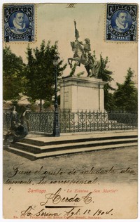 Alameda, La Estatua San Martín , Santiago [fotografía] / Carlos Brandt. Santiago : Carlos Brandt , 1904. 1 tarjeta postal : colotipo, fotomecánico monocromo sobre papel ; 14 x 9 cm. .