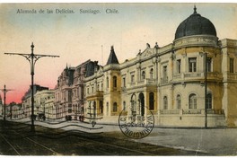 Alameda de las Delicias. Santiago, Chile [fotografía] / J. M. Sepúlveda V. Santiago : J. M. Sepúlveda V. , 1916. 1 tarjeta postal : colotipo, fotomecánico policromo sobre papel ; 14 x 8,8 cm. .