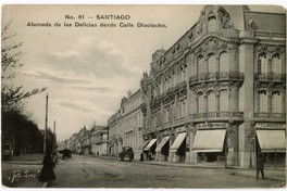 No. 61 - Santiago - Alameda de las Delicias desde Calle Dieciocho [fotografía] / Foto Leon. Santiago : Foto Leon, [entre 1911 y 1916]. 1 tarjeta postal : colotipo, fotomecánico monocromo sobre papel ; 14 x 9 cm. .