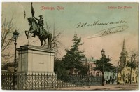 Santiago, Chile Estatua San Martín : [Ubicada en el bandejón central de la Alameda de Las Delicias, frente la calle San ignacio; en la vereda sur, se aprecia la Iglesia San Vicente de Paul] [fotografía].