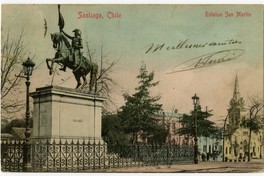 Santiago, Chile Estatua San Martín : [Ubicada en el bandejón central de la Alameda de Las Delicias, frente la calle San ignacio; en la vereda sur, se aprecia la Iglesia San Vicente de Paul] [fotografía]. Santiago : [Editor no identificado , Entre 1900 y 1910]. 1 tarjeta postal : colotipo, fotomecánico policromo sobre papel ; 13,7 x 8,7 cm. .