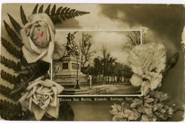 Estatua San Martín, Alameda. Santiago, Chile [fotografía]. Santiago : [Editor no identificado, entre 1900 y 1910]. 1 tarjeta postal : fotografía, monocromo gelatina sobre papel ; 13,8 x 8,8 cm. .