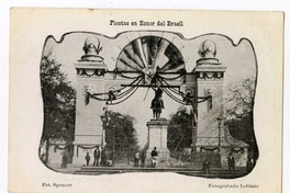 Fiesta en Honor del Brasil : [Arco homenaje a marinos brasileros, del crucero "Almirante Barroso"] [fotografía] / Foto Spencer. Santiago : Foto Spencer , [1903]. 1 tarjeta postal : medio tono, fotomecánico monocromo sobre papel ; 13,5 x 9,2 cm. .