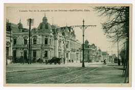 Costado Sur de la Alameda de las Delicias.-Santiago, Chile : [Palacio Aldunate (Alameda con calle Ejército) contiguo a la Residencia Borie y el Palacio Vergara, hoy demolido (Alameda con calle Vergara)] [fotografía]. Santiago : [Editor no identificado , Entre 1915 y 1920]. 1 tarjeta postal : huecograbado, fotomecánico monocromo sobre papel ; 13,5 x 8,5 cm. .