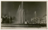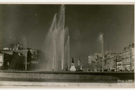 Chile, Santiago.- Av. B. O'Higgins : [Bandejón central, frente al Palacio de La Moneda: Fuente con chorros que realizan Juegos de agua; al fondo, el monumento a Bernardo O'Higgins; vereda Sur: la torre de la Iglesia San Francisco, un edificio de departamentos, con un aviso de neumáticos "Firestone" en la terraza; vereda norte, el Club de la Unión, edificio de la "Mueblería París", a su lado la "Muebleria C. Colon", entre otras casonas y comercio] [fotografía] / Fot. Mora. Santiago : Fot. Mora , [Entre 1930 y 1940]. 1 tarjeta postal : fotografía, monocromo, gelatina sobre papel ; 13,5 x 8,5 cm. .
