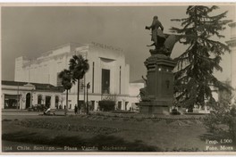 Chile. Santiago.- Plaza Vicuña Mackenna [Monumento en homenaje a Benjamín Vicuña Mackenna, en medio de la Biblioteca Nacional y el Cerro Santa Lucía. En la vereda sur, calle alameda con San Isidro, el Teatro Santa Lucía y la "Droguería y Botica "Miraflores"] [fotografía] Foto Mora.