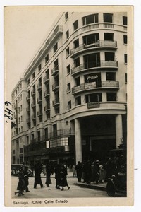 Santiago (Chile) Calle Estado [fotografía]. Santiago : [Editor no identificado , 193u]. 1 tarjeta postal : fotografía, monocromo, gelatina sobre papel ; 8 x 13 cm. .