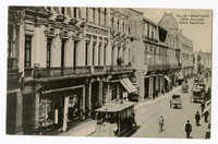 Residencias y establecimientos comerciales (planta baja), edificios de tres plantas, con balcones de fierro y ornamentación arquitectónica: Almacén de Música y Pianos, objetos de arte, Articulos de escritorio y otros de C. Kirsinger y Co., Mas adelante, un inmueble coronado por una gran cúpula. Transeúntes, carros de sangre y el Tranvía N° 23.