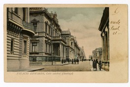 Palacio Edwards, Calle Catedral (Santiago) [Fotografía] / Morel Hermano. Santiago : Morel Hermano , 1905. 1 tarjeta postal : colotipo, fotomecánico monocromo sobre papel ; 11,5 x 7 cm. .