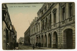 Calle de la Merced, Santiago. Chile [fotografía] / Juan M. Sepúlveda V. Santiago : Juan M. Sepúlveda V. , [Entre 1912 y 1922]. 1 tarjeta postal : colotipo, fotomecánico policromo sobre papel ; 14 x 9 cm. .