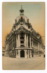 Materias: Tarjetas postales - Arquitecto - Santiago (Chile : Ciudad) - Calle Bandera (Santiago, Chile) - Jéquier, Émile - Calle Moneda (Santiago, Chile) - Bolsa de Comercio de Santiago (Chile) - Historia - Fotografías - Arquitectura - Edificios históricos