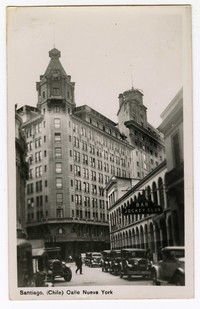 Santiago, (Chile) Calle Nueva York : [Barrio La Bolsa; Edificio Ariztia y edificio de dos pisos y altillo, en cuya planta baja funcionaba el Bar Jockey Club] [fotografía]. Santiago : [Editor no identificado , Entre 1921 y 1929]. 1 tarjeta postal : fotografía, monocromo, gelatina sobre papel ; 8 x 13 cm. .