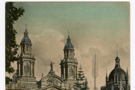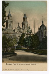 Materias: Historia - Arquitectura religiosa - Fotografías - Chile - Arquitectura - Iglesia Católica - Edificios históricos - Tarjetas postales - Santiago - Arquitectura del paisaje - Plaza de Armas (Santiago, Chile) - Santiago (Chile : Ciudad) - Empresa de Correos de Chile - Catedral de Santiago (Santiago, Chile) - Bazar Alemán y Juguetería Krauss Hermanos (Santiago, Chile)