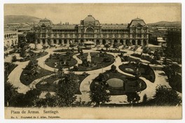 [Plaza de Armas, Santiago : [Portal de Sierra Bella, hoy, Portal Fernández Concha, con El Gran Hotel de Francia y el Hotel Milán en sus pisos superiores, Al centro, vista parcial del Edificio Edwards (esquina de Estado con Merced); a la izquierda, el Portal Mac Clure, hoy Portal Bulnes. Monumento "A La Libertad de América" o a "La Victoria de Ayacucho", emplazado en el centro de la Plaza] [fotografía] / J. Allan. Santiago : J. Allan , [1910]. 1 tarjeta postal : colotipo, fotomecánico monocromo sobre papel ; 14 x 9 cm. .