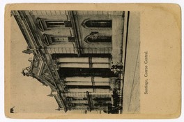 Santiago, Correo Central [fotografía]. Santiago : [Editor no identificado , Entre 1890 y 1900]. 1 tarjeta postal : colotipo, fotomecánico monocromo sobre papel ; 8,2 x 10,3 cm. .