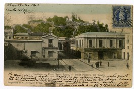 Dedicatoria manuscrita en el tiro: "S[an]tiago, 27-Nov. 1903 Casilla 10593. Sta. María Oliver: recibí su tarjeta, la que retorno con mucho gusto con la presente i le promeeto enviarle vistas de Santiago. Sírvase Ud. mandarme de todo Uruguai siempre que sean bonitas. Ordene en ésta a su Ato. S. Mario Lillo". Dirigida a María Oliver, Montevideo (Uruguay) Cuareim 60. Vía Cordillera.