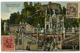 Cerro de Santa Lucia Santiago de Chile [fotografía] / Almacen de Musica Carlos Friedemann. Santiago : Almacen de Musica Carlos Friedemann, [Entre 1911 y 1915]. 1 tarjeta postal : colotipo, fotomecánico policromo sobre papel ; 14 x 9 cm. .