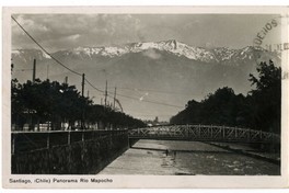 Santiago (Chile) Panorama Río Mapocho [fotografía]. Santiago : [Editor no identificado] , 1939. 1 tarjeta postal : fotografía, monocromo, gelatina sobre papel ; 13 x 7,8 cm. .