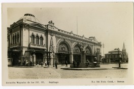 Estación Mapocho de los FF. CC. Santiago [fotografía] / Foto Cood. Santiago : Foto Cood , [Entre 1916 y 1925]. 1 tarjeta postal : fotografía, monocromo, gelatina sobre papel ; 14 x 9 cm. .