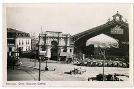Materias: Empresa de los Ferrocarriles del Estado (Chile) - Automóviles antiguos y clásicos - Tarjetas postales - Edificios históricos - Ferrocarriles - Arquitectura - Fotografías - Schneider et Cie. (Le Creusot, Francia) - Basílica de Nuestra Señora del Perpetuo Socorro (Santiago, Chile) - ESTACIONES DE FERROCARRIL - Edificios, estructuras, etc - Santiago (Chile : Ciudad) - Edificios y estructuras - Historia - Camiones - Estación Central (Santiago, Chile)