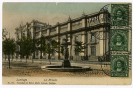Santiago La Moneda [fotografía] / Adolfo Conrads. Santiago : Adolfo Conrads , 1911. 1 tarjeta postal : colotipo, fotomecánico policromo sobre papel ; 14 x 9 cm. .