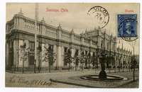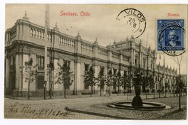 Santiago, Chile [Palacio de la] Moneda [fotografía]. Santiago : [Editor no identificado] , 1907. 1 tarjeta postal : colotipo, fotomecánico monocromo sobre papel ; 13,8 x 8,8 cm. .