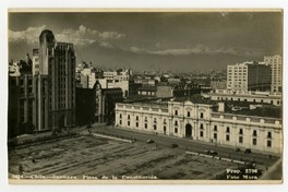 Chile.- Santiago, Plaza de la Constitución : [Palacio de la Moneda, el edificio de la Intendencia y el edificio de la Caja de Seguro Obrero, entre otros] [fotografía] Fot. Mora.