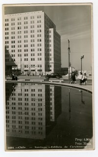 Chile.- Santiago.- Edificio de Carabineros [fotografía] / Foto Mora. Santiago : Foto Mora , 1954. 1 tarjeta postal : fotografía, monocromo, gelatina sobre papel ; 8,4 x 13,6 cm. .