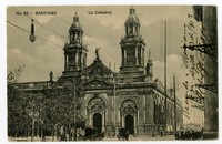 Santiago La Catedral [fotografía] / Foto Leon. Santiago : Foto Leon , 1913. 1 tarjeta postal : colotipo, fotomecánico monocromo sobre papel ; 13,8 x 8,8 cm. .