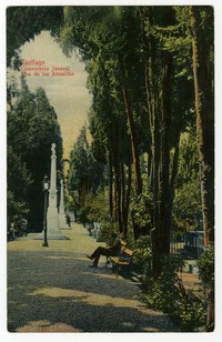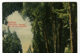 Santiago, Cementerio Jeneral Una de las Avenidas [fotografía] / C. Kirsinger & Cia. Santiago : C. Kirsinger& Cia. , [entre 1907 y 1911]. 1 colotipo : fotomecánico policromo sobre papel ; 9 x 14 cm. .