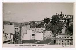 Valparaiso, Cerro Alegre y Ascensor [fotografía] / Cigarrería "Richmond". Valparaíso : Cigarrería "Richmond", [1938]. 1 tarjeta postal : fotografía, monocromo, gelatina sobre papel ; 13,8 x 8 cm. .