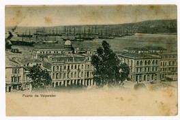 Puerto de Valparaiso [fotografía]. Valparaíso : [Editor no identificado , Entre 1910 y 1920]. 1 tarjeta postal : colotipo, fotomecánico monocromo sobre papel ; 13,5 x 6,5 cm. .