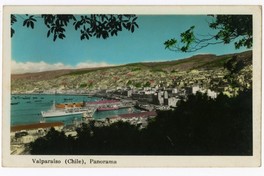 Valparaíso (Chile), Panorama [fotografía] Valparaíso : [Editor no identificado] , 1956. 1 tarjeta postal : fotografía, policromo gelatina sobre papel ; 13,6 x 8,7cm. .