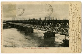 Talca - Puente sobre el Claro [fotografía] / Libreria Nacional de Enrique Prieto. Talca : Libreria Nacional de Enrique Prieto , 1905. 1 tarjeta postal : colotipo, fotomecánico monocromo sobre papel fibra ; 14 x 9 cm. .