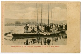 Constitución - En viaje de regreso á Talca - Rio Maule [fotografía] / Libreria Nacional de Enrique Prieto, Talca : Libreria Nacional de Enrique Prieto , [entre 1904 y 1912]. 1 tarjeta postal : colotipo, fotomecánico monocromo sobre papel fibra ; 14 x 9 cm. .