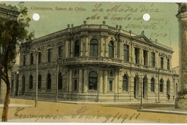 Concepcion, Banco de Chile [fotografía] / Adolfo Stegmann. Concepción : Adolfo Stegmann , 1911. 1 tarjeta postal : colotipo, fotomecánico policromo sobre papel fibra ; 14 x 9 cm. .