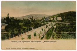 Escuela P. de Agricultura de Concepcion. Avenida Principal [fotografía] / Carlos Brandt. Concepción : Carlos Brandt , [Entre 1900 y 1909]. 1 tarjeta postal : colotipo, fotomecánico policromo sobre papel ; 14 x 9 cm. .
