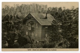 Lota - Chalet del administrador en el parque [fotografía] / Carlos Bivort. Lota : Carlos Bivort , [Entre 1909 y 1915]. 1 tarjeta postal : colotipo, fotomecánico monocromo sobre papel fibra ; 14 x 9 cm. .