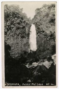 Tolhuaca, Salto Malleco 40 m. [fotografía]. Chile : [Editor no identificado] , 1998. 1 tarjeta postal : fotografía, monocromo, gelatina sobre papel fibra ; 9 x 14 cm. .
